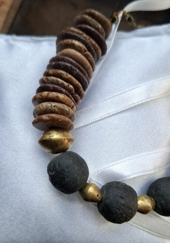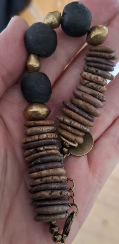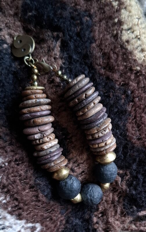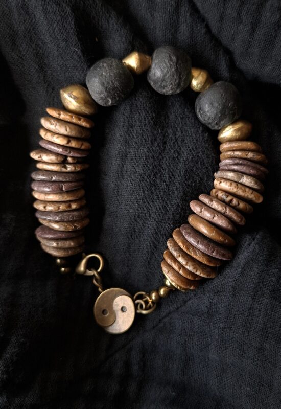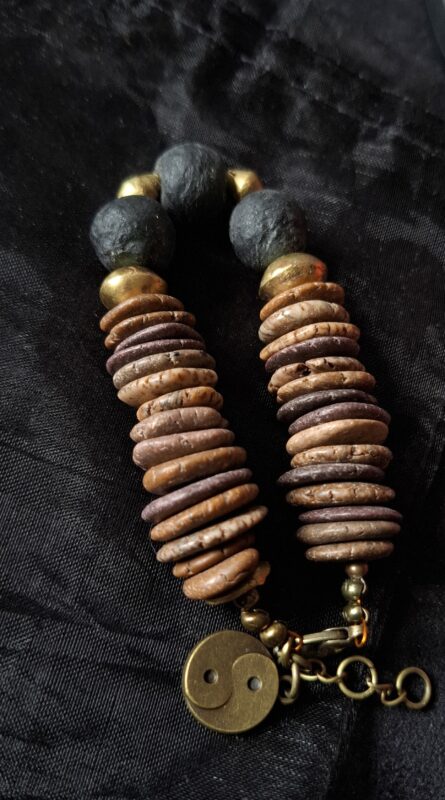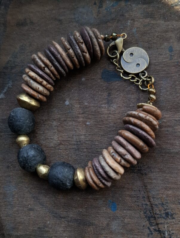 Prachtige stoere schijfjes, met matte zwarte Afrika glaskralen en brons Berber, een bedel yin yang
