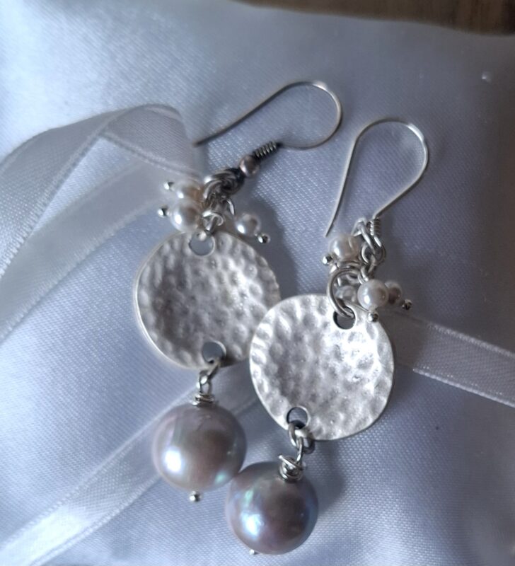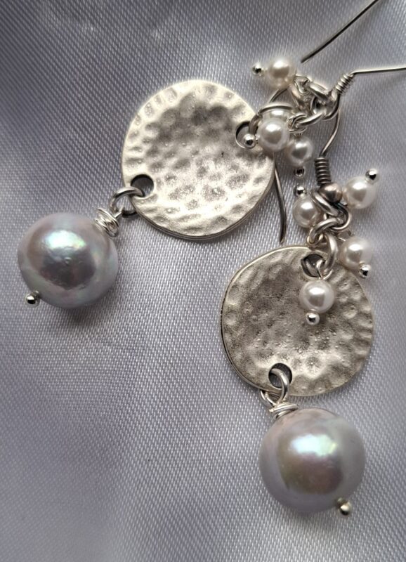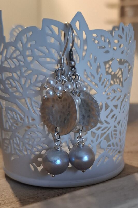 Prachtig gehamerd antiek verzilverd element…kleine pareltjes ende grote aan mooie Sterling zilveren haakjes