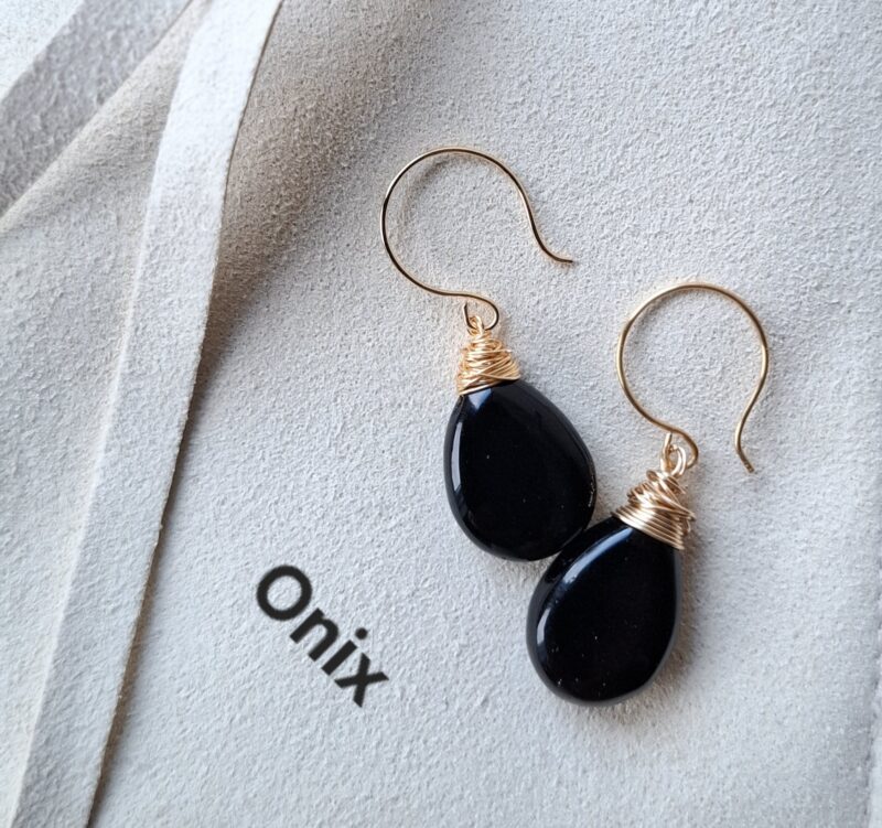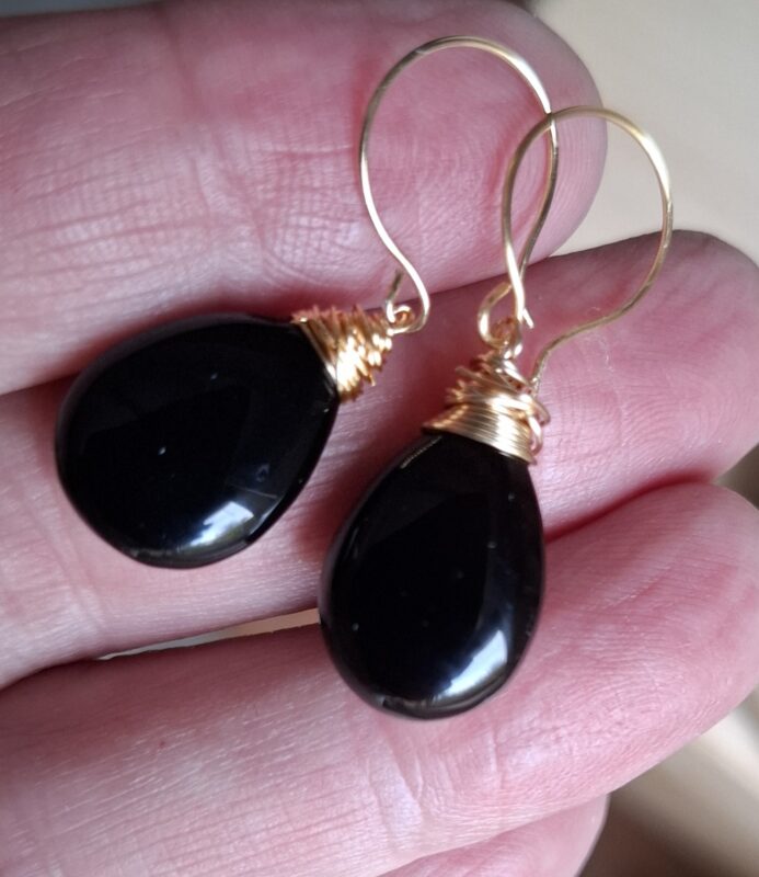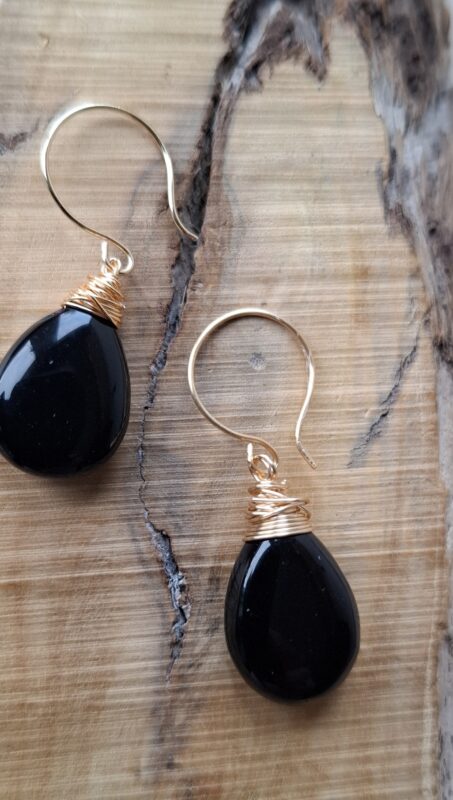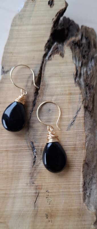 Prachtige zwarte stenen, 14k goldfilled gewrapped, ruim 3.5 cm totaal