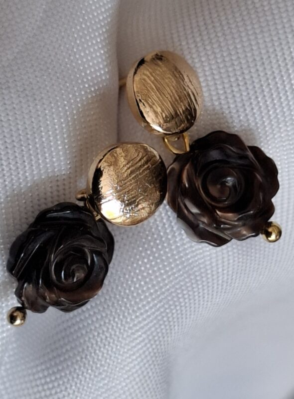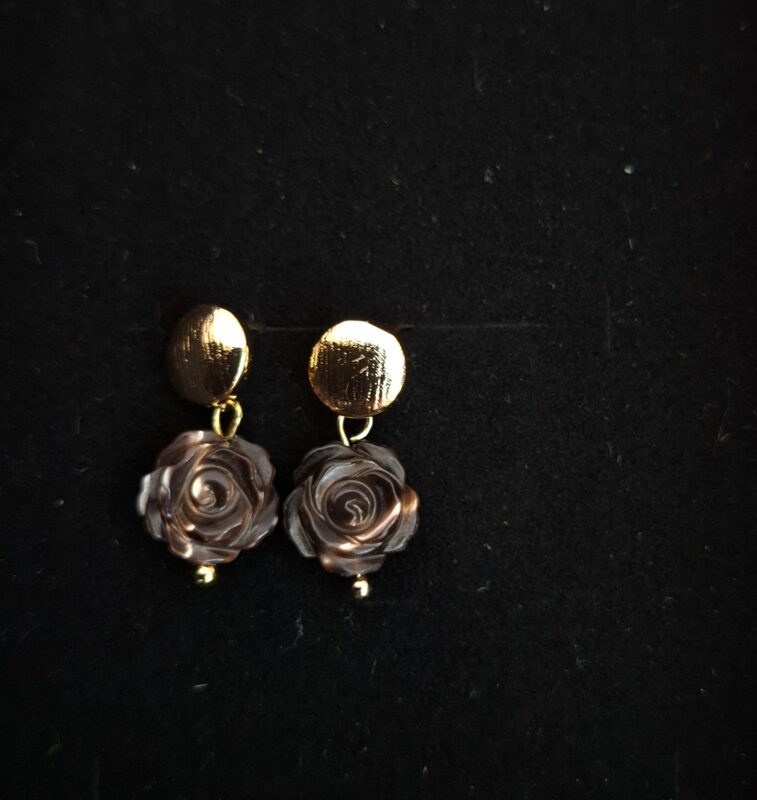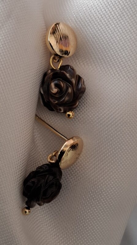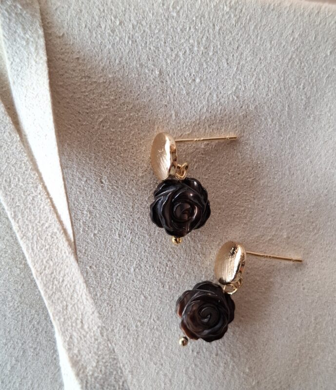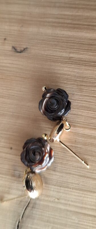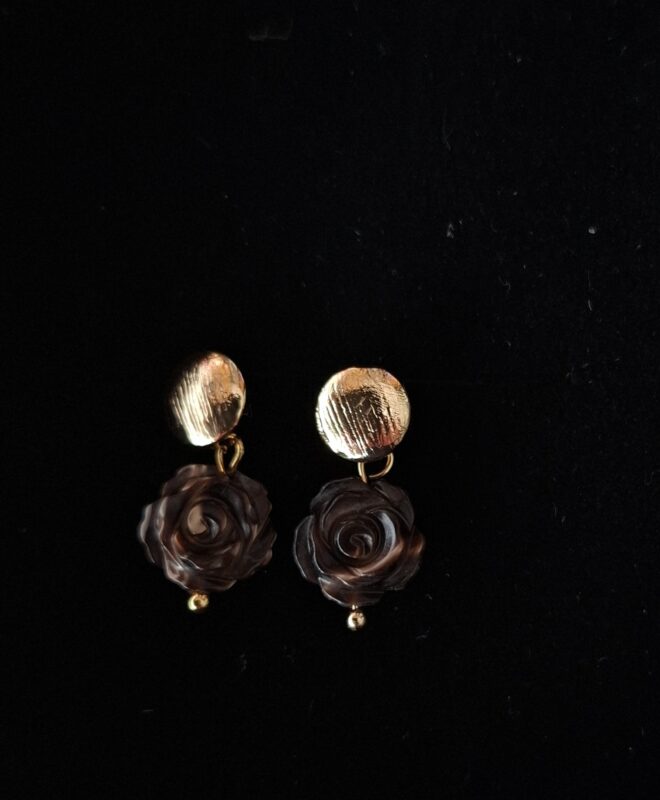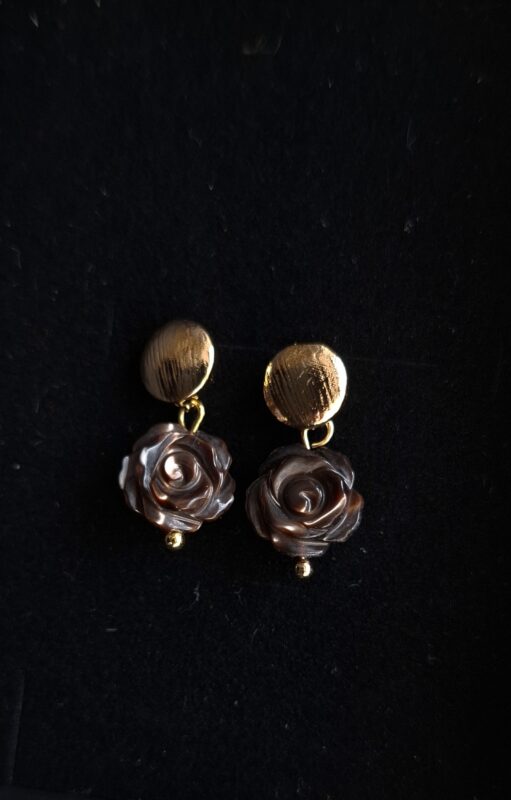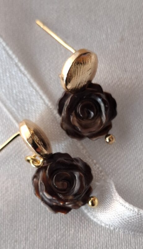 Handgesneden chocoladebruin met vlammetje erin aan 14k goldplated stekertjes