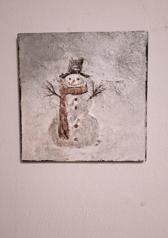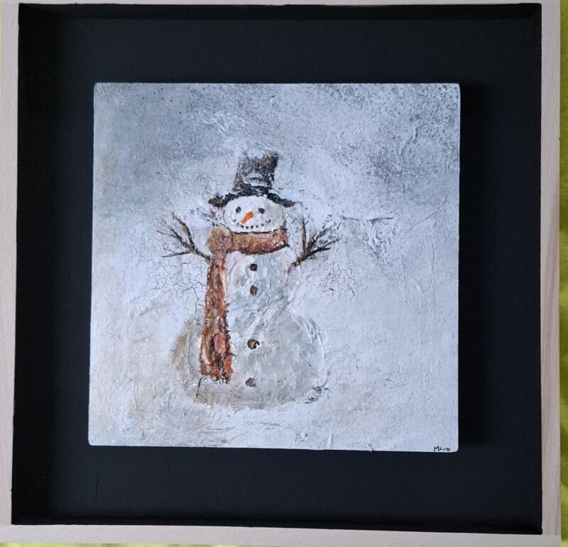 Sneeuwpop op hout paneeltje in hout panneel gelijst 30×30